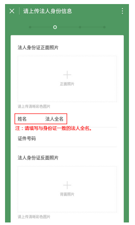 第三步:填寫(xiě)法人信息,需要填寫(xiě)法人姓名、身份證號(hào)碼、證件有效期和上傳證件正面和背面照片,但需要注意的是,法人信息必須與營(yíng)業(yè)執(zhí)照上顯示的一致,重點(diǎn)哦。